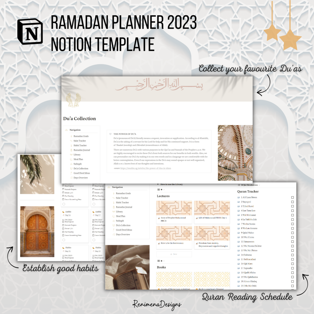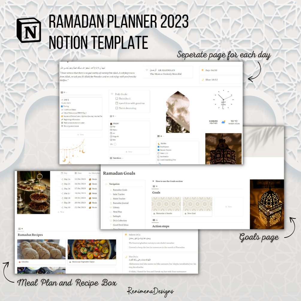 Bismillah, this Ramadan Notion Template was designed as a comprehensive companion for you to make the best out of the holy month with everything you need in one place. The all-in-one Ramadan Planner will keep you accountable troughout the whole month and gets you excited for each new day. Build good habits, strenghten your Deen and reach your Goals to have the Ramadan you always dreamt of - with the help of this Notion Template. Every page was created with love and the intention to help you make the most out of Ramadan, insha'Allah.